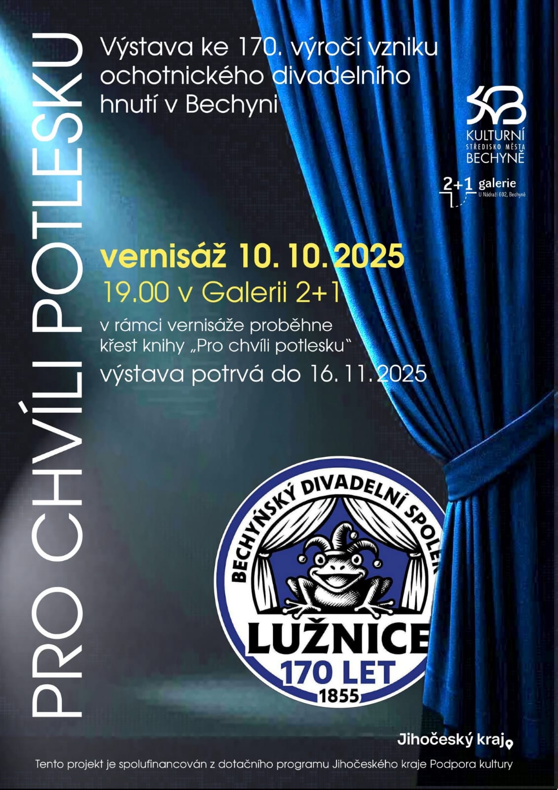 Vernisáž uvedl principál souboru Lužnice Bechyně Jaroslav Mrzena spolu se starostou města Bechyně Štěpánem Ondřichem. Po té dostalo prostor osvědčené hudební duo Jan Ingr&Zdeněk Vřešťál. Po hudební ouvertuře přišel na řadu křest knihy věnované stosedmdesátileté historii ochotnického divadelního hnutí v Bechyni a všem, kteří tuto historii pomáhali svou láskou k národu, jeho jazyku a kultuře tvořit. Krátce knihu s názvem PRO CHVÍLI POTLESKU představil a poděkoval všem, kteří její vznik přímo i nepřímo podpořili, autor a dlouholetý člen bechyňského souboru Karel Vontroba. Po té již byla všem hojným zájemcům ze strany bechyňského obyvatelstva zpřístupněna výstava představující činnost a tvorbu souboru v průběhu času. Návštěvníci si mohli prohlédnout dobové rekvizity, kostýmy, fotografie i množství ocenění, která soubor i jednotlivci za svou činnost a výkony obdrželi. Celou výstavou, formou ilustrací, provází žába, jenž je v současnosti i součástí loga souboru. Exponáty rovněž doplňují vtipné „hlášky“ spontánně vzniklé v průběhu inscenací jako improvizace textu nebo emocionální reakce na dění, které nakonec „zdomácněly“ a dodnes jsou součástí jazyka a komunikace souboru. Výstava je ke shlédnutí denně až do 16.11.2025.